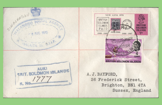 British Solomon Islands 1970 Auki registered cover with Postal Agency cachet, Sinalanggu Postal Agency