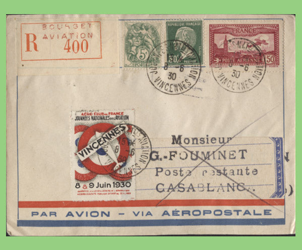 France 1930 Registered Bourget Aviation Flight cover to Casablanca with tied label